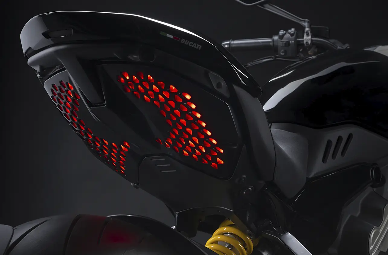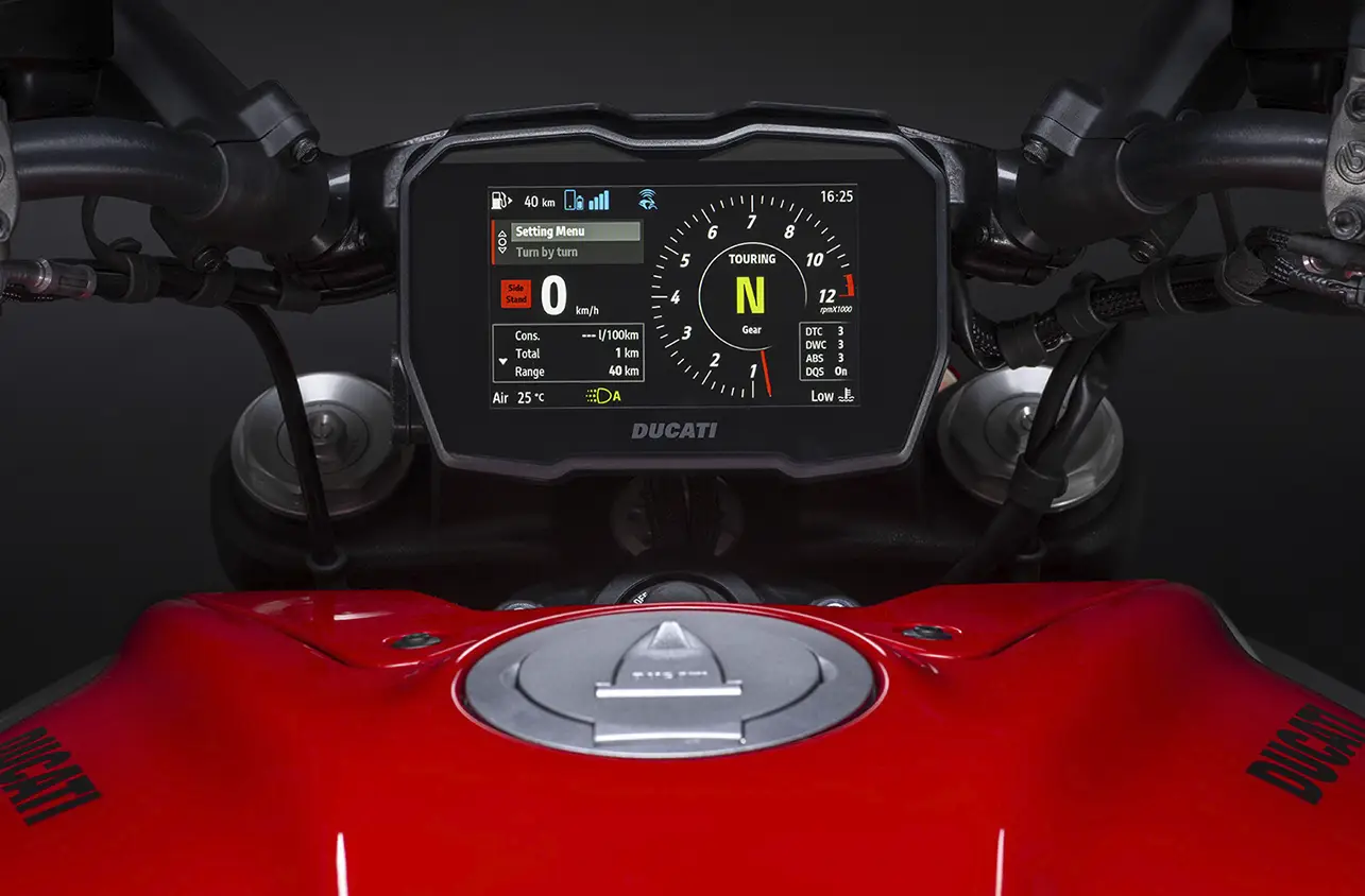 Modos de pilotagem, modos de potência, ABS com assistência em curvas, controle de tração Ducati, luz de freio Ducati.